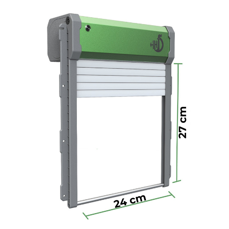 Roletová dvířka HHD-0865 Vám ušetří čas, zvýší bezpečí vašich slepic a zajistí spolehlivý chod kurníku – plně automaticky, solárně a s nízkými provozními náklady.