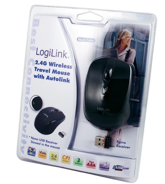 Mini myš k notebooku s 2,4 GHz technologií od LogiLink s optickým senzorem a snímacím rozlišením 800 dpi pro vysokou přesnost a rychlou odezvu. Připojení je pomocí přiloženého USB mini přijímače s automatickým rozpoznáním zapojení myši. Mini přijímač lze uložit v pouzdru myši. Kromě optického snímání a vertikálního scrollovacího kolečka je myš vybavena 3 tlačítky.