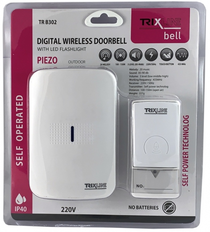 Bezdrátový zvonek Trixline BELL je skvělé řešení všude tam, kde není možné nainstalovat klasické drátové připojení. Mezi hlavní přednosti patří velmi snadná montáž, bezbateriový provoz PIEZO tlačítka.