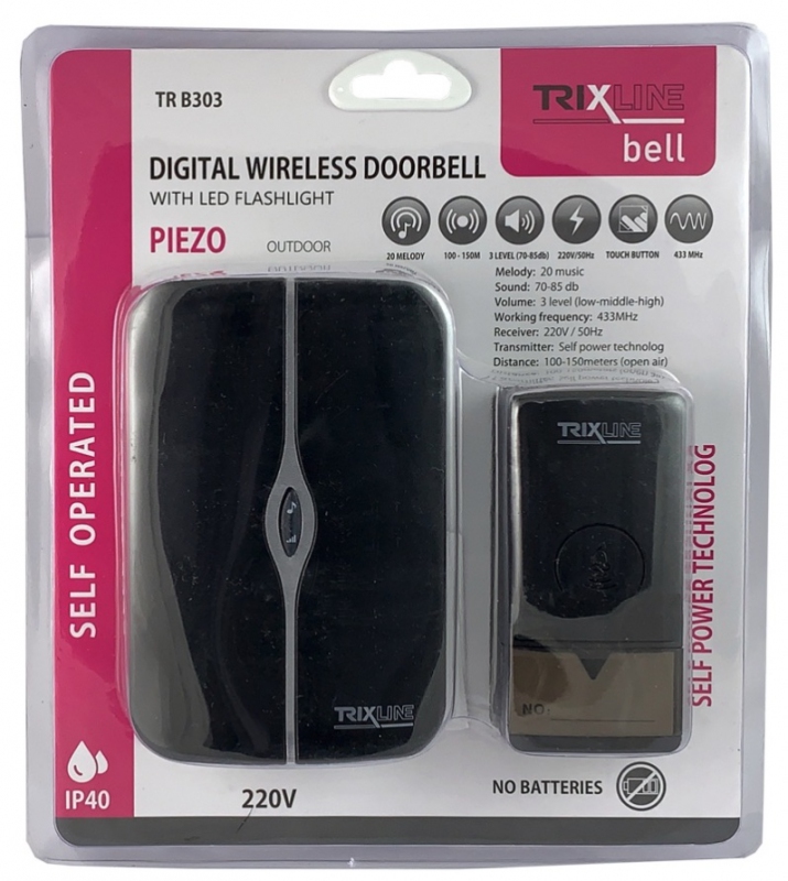Bezdrátový zvonek Trixline BELL je skvělé řešení všude tam, kde není možné nainstalovat klasické drátové připojení. Mezi hlavní přednosti patří velmi snadná montáž, bezbateriový provoz PIEZO tlačítka.