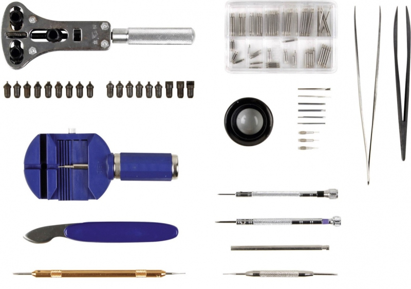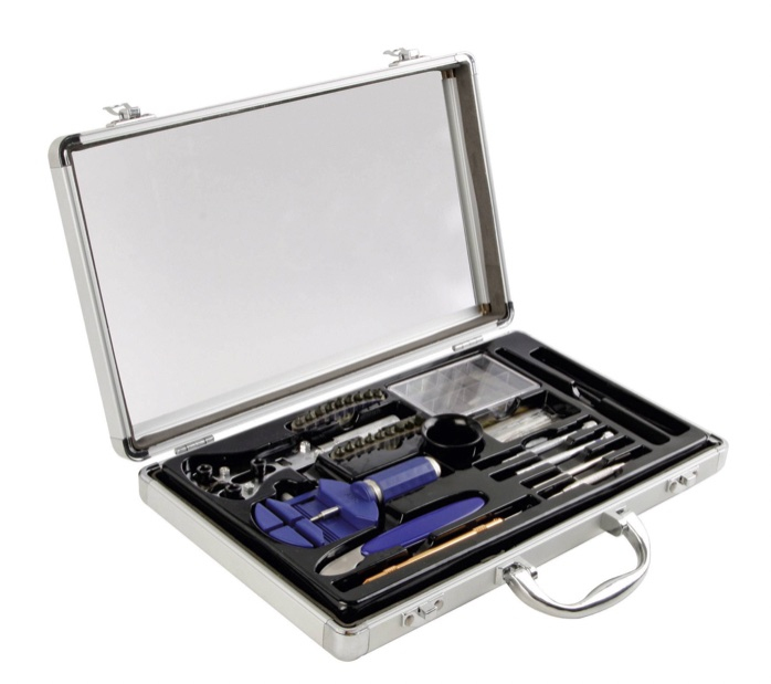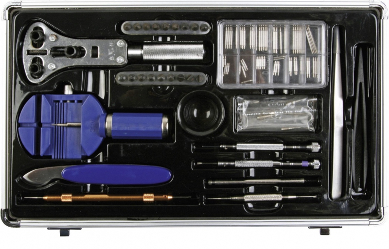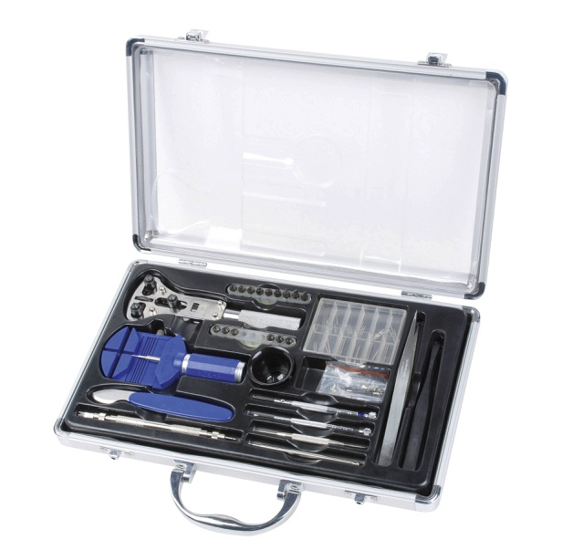 Kompletní výbava k opravě hodinek v jediném kufříku. Odolný hliníkový kufr obsahuje všechny důležité nástroje pro menší opravy kapesních a náramkových hodinek. V balení mimo jiné najdete hodinářskou lupu, otvírák krytu hodinek, sadu osiček, sadu pružinek, těsnící kroužek, hodinářské šroubováky s náhradními hroty a mnoho dalších nezbytností, ke kterým budete potřebovat už jen šikovné ruce.