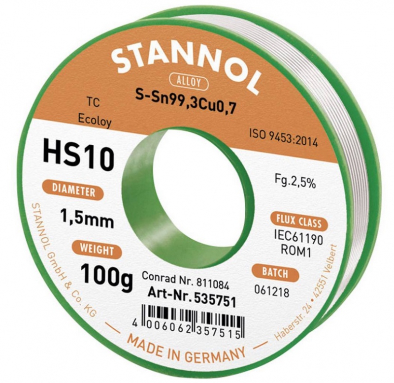 Teplota tání je u této pájky cca 227 °C. Cenově výhodná, bezolovnatá slitina k úpravám plošných spojů.