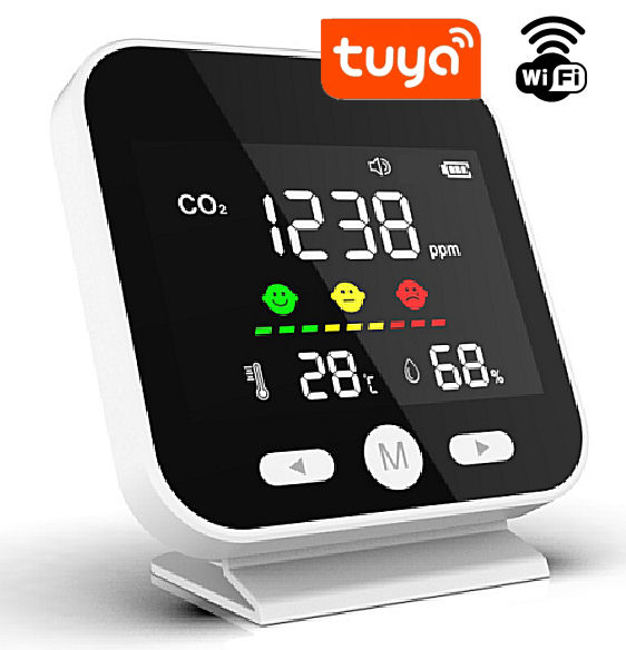 Designový detektor CO2 (monitor ’vydýchaného vzduchu’), svým provedením je vhodný např. do bytu či kanceláře, na LCD displeji zobrazuje úroveň CO2, teplotu, vlhkost. Díky aplikaci Tuya Smart lze naměřené hodnoty využít pomocí automatizace k akci s chytrou zásuvkou, sepnout vzdálenou sirénu, ovládat chytrou žárovku, automatické otevíraní oken, či spuštění ventilátoru. Je možné využít i naměřené hodnoty vlhkosti či teploty pro spuštění automatizace (odvlhčovače, zapnutí topení, klimatizace). Funguje i jako chytrý termostat/hygrostat.
