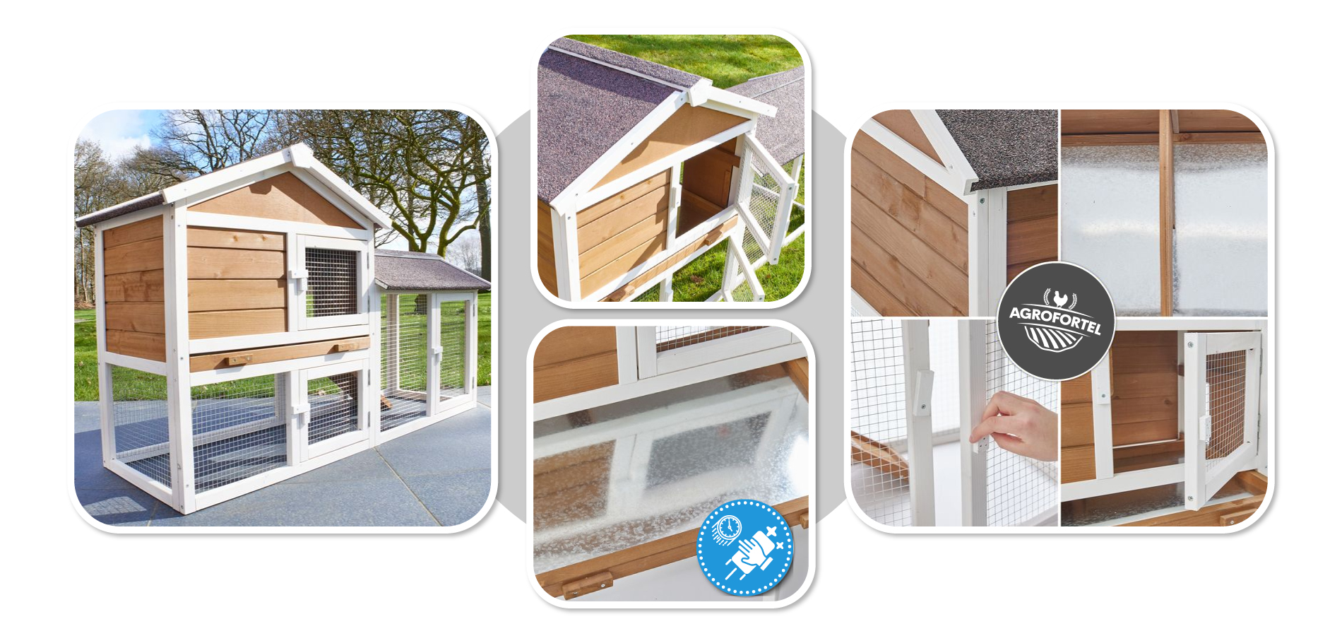 - Snadné čištění díky výsuvnému šuplíku na trus (trusníku) a snadno oddělitelné střeše.