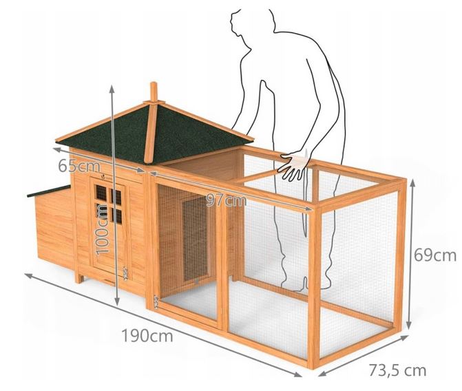 Rozměry kurníku jsou 1900x735x1000 mm, a váha činí 33 kg. Produkt je dodáván v jednom balíku.