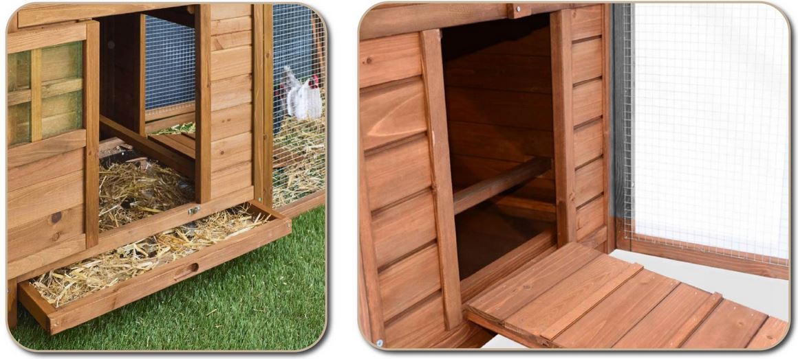 Kurník je vybaven zásuvkou pro snadné vyprazdňování trusu. U dřevěného kurníku je zapotřebí údržbu za účelem prevence proti nemocem a parazitům provádět alespoň alespoň jednou měsíčně, například pomocí našich produktů proti čmelíkům. Odstraňování trusu a výměna podestýlky by měla být prováděna alespoň jednou týdně.