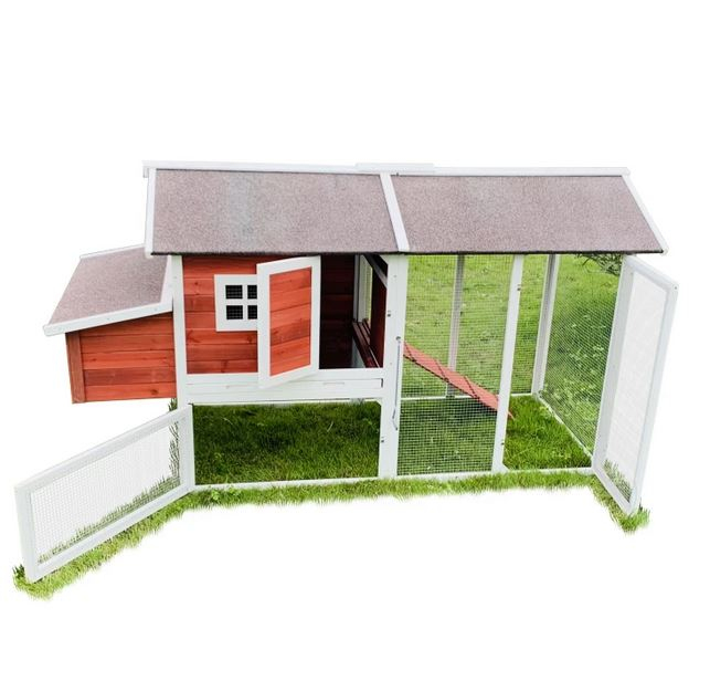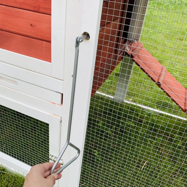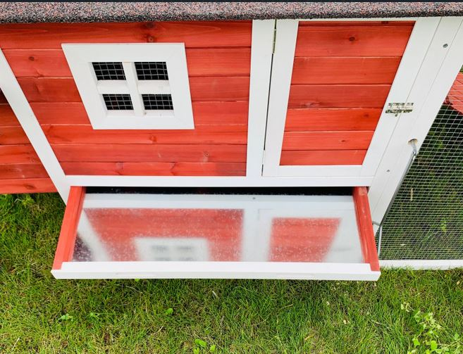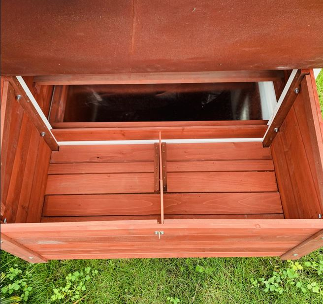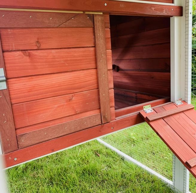 Nechybí ani velká otevíratelná dvířka pro přístup do výběhu a menší dvířka pod domečkem. Všechna dvířka jsou chráněna uzamykacím systémem pro vyšší bezpečnost.