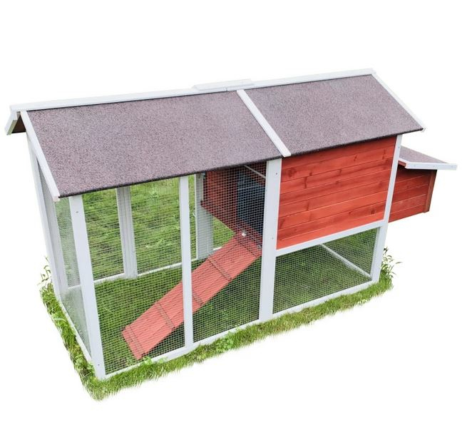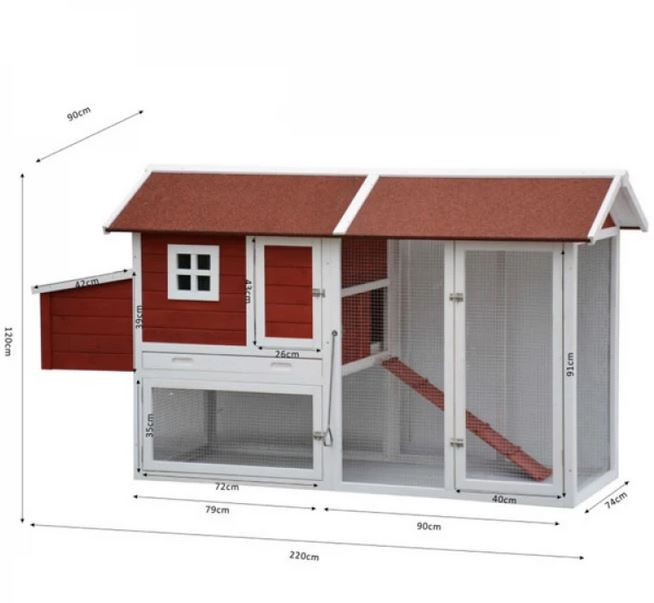 Vnější rozměry celého kurníku i s výběhem jsou 2200x740x1200 mm a poskytuje tak pohodlí pro 7-8 klasických nosnic.