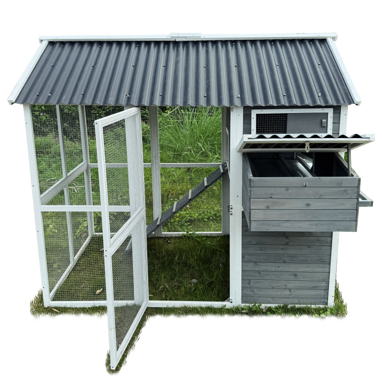 S rozměry 196 × 141 × 180 cm poskytuje domov až pro 6 slepic. Stěny kurníku jsou z masivního dřeva v kombinaci šedé a bílé barvy, materiál střechy je vlnitý plast, který zcela bezpečně chrání před deštěm, sněhem i horkým sluncem. Součástí je také velký oplocený výběh z pozinkovaného pletiva, kde mají slepice dostatek prostoru k pohybu na čerstvém vzduchu a trávě.Uvnitř kurníku se nachází hřad pro noční odpočinek, rampa spojující obytnou část s výběhem a boční snáškové hnízdo s výklopnou střechou pro snadný sběr vajíček.Snadnou údržbu zajišťuje výsuvný trusník (výsuvná podlaha). Zdraví vašich slepiček prospěje ventilační okénko s pletivem, které zajišťuje přístup čerstvého vzduchu, který je pro správné životní podmínky zcela nezbytný.Přístup dovnitř kurníku je snadný díky velkým dvířkům na přední i zadní straně a bočním dveřím do výběhu.