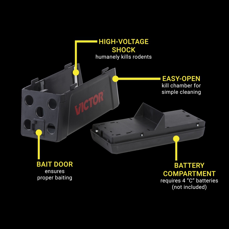 - Tato velmi výkonná past dokáže usmrtit až 50 potkanů na jednu sadu plně nabitých baterií (4 baterie typu C – nejsou součástí balení).