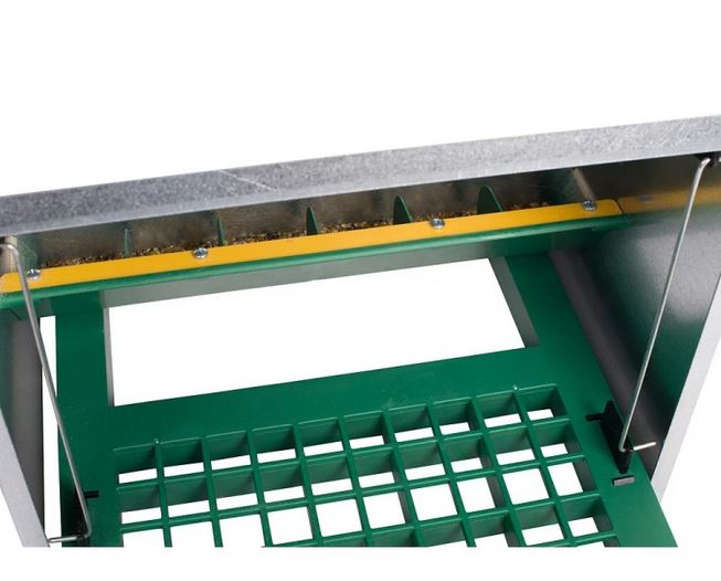 Samotné krmítko je opatřeno přepážkami a přelévací hranou, které výrazně omezují vypadávání. Další užitečná výhoda; díky použití plastu je krmítko mnohem tišší než jeho konkurenti. Kov na plast vytváří méně hluku než kov na kov. Stupátko má velké otvory, takže výkaly propadnou dolů. Mechanismus, který řídí přístup, lze nastavit od 250 gramů do 2 kg. Tímto způsobem lze nastavit správnou prahovou hmotnost pro drůbež jakéhokoli druhu.