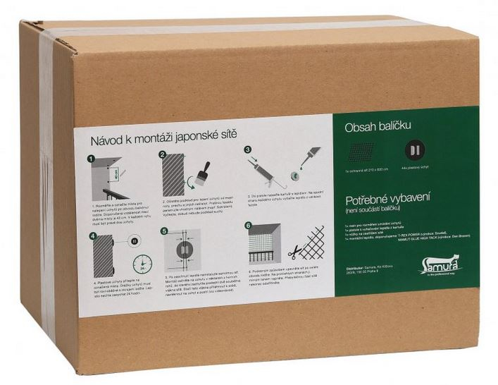 Součástí instalační sady je japonská černá síť (6 × 2,7 m) a plastové úchyty. Součástí balení je návod s přesným popisem montáže.