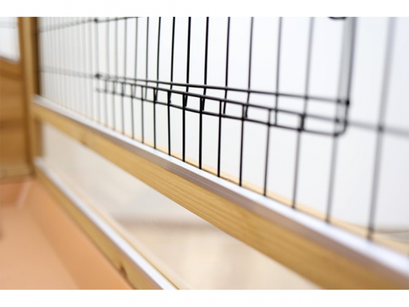 Klec je vybavena dřevěným domkem s odpočívadlem. Králík, morče nebo jiní hlodavci budou mít v této stylové kleci dostatek prostoru a pohodlí. Nebude jim chybět ani dostatek světla, jelikož spodní část klece je vybavena plexisklem, které snižuje vypadávání hoblin z klece. Zbytek klece je pro dobrý výhled vyroben z kvalitní mřížky o síle drátu 2 mm s roztečí drátu 14 mm. Na každé noze klece je připevněno kolečko s brzdou pro snadnější manipulaci.