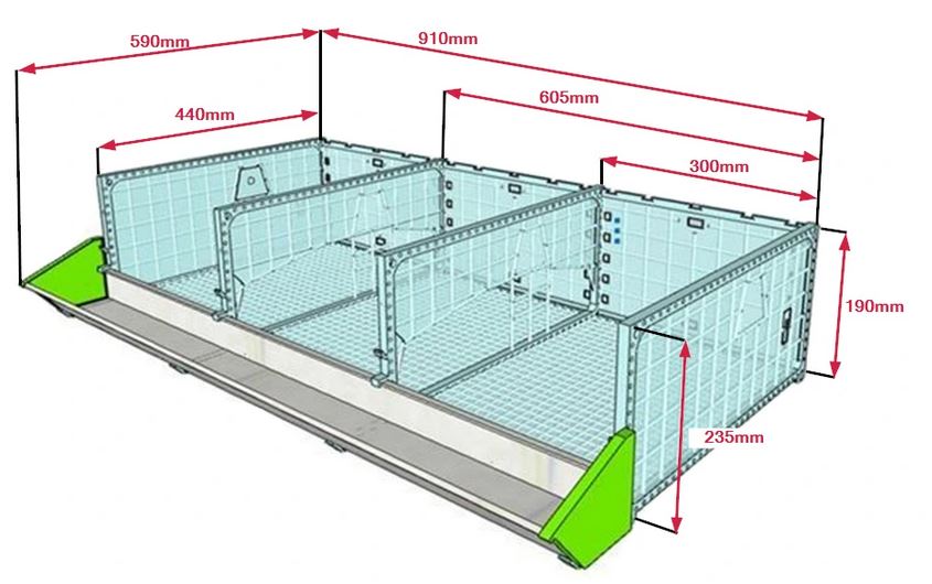 Rozměry jednotlivých oddílů klece jsou uvedeny na obrázku níže: