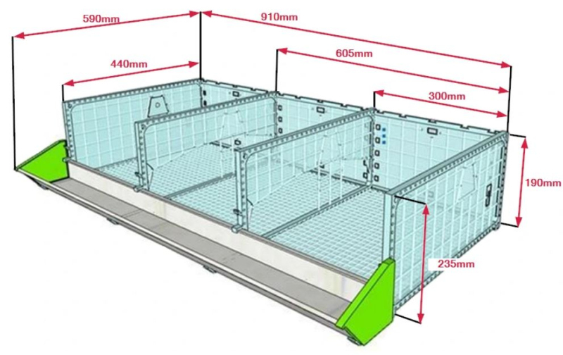 Rozměry jednotlivých oddílů klece jsou uvedeny na obrázku níže