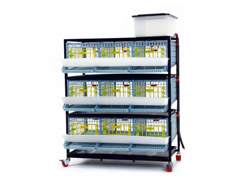 Z této moderní klece pro chov křepelek budete zcela jistě nadšeni. Klec s patentovanou technologií Comfortplast nabízí vysoký komfort a pohodlí a péče o křepelky s ní bude jedna báseň. Křepelky mají v každém patře klece umístěné krmítko s mřížkou proti rozhrabávání krmiva a napáječky s přívodem vody z 20l zásobníku. Skvělé na těchto klecích je, že křepelky nemusíte při chovu vůbec vyrušovat, jelikož jejich vajíčka si během chviličky odeberete ze snáškových zásobníků.