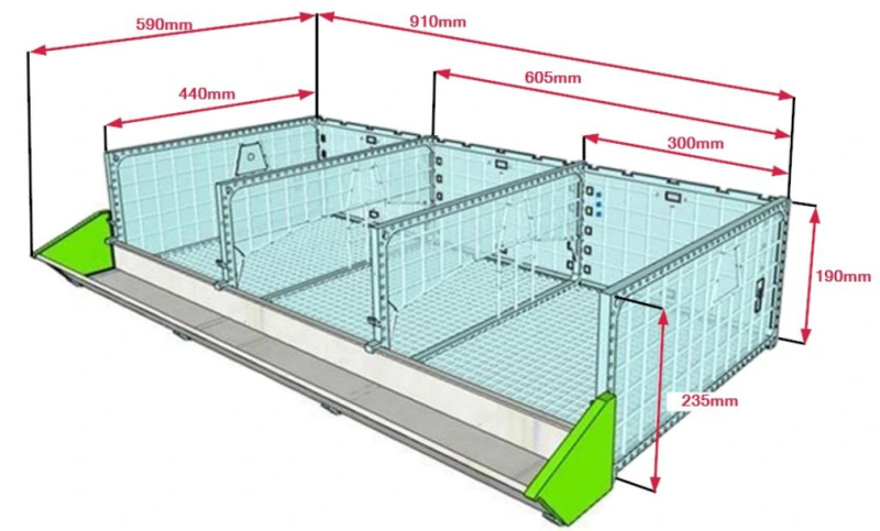 Rozměry jednotlivých oddílů klece jsou uvedeny na obrázku níže