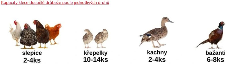 Kapacity klece dospělé drůbežepodle jednotlivých druhů