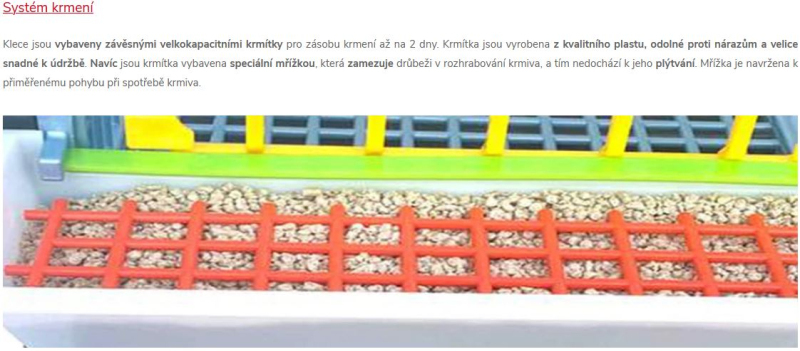 Klece jsou vybaveny závěsnými velkokapacitními krmítky pro zásobu krmení až na 2 dny. Krmítka jsou vyrobena z kvalitního plastu, odolné proti nárazům a velice snadné k údržbě. Navíc jsou krmítka vybavena speciální mřížkou, která zamezuje drůbeži v rozhrabování krmiva, a tím nedochází k jeho plýtvání. Mřížkaje navržena k přiměřenému pohybu při spotřebě krmiva.