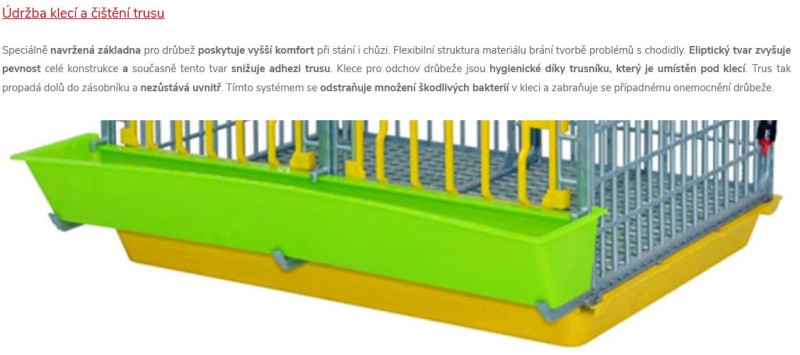 Speciálně navržená základna pro drůbež poskytuje vyšší komfort při stání i chůzi. Flexibilní struktura materiálu brání tvorbě problémů s chodidly. Eliptický tvar zvyšuje pevnost celé konstrukce a současně tento tvar snižuje adhezi trusu. Klece pro odchov drůbeže jsou hygienické díky trusníku, který je umístěn pod klecí. Trus tak propadá dolů do zásobníku a nezůstává uvnitř. Tímto systémem se odstraňuje množení škodlivých bakterií vkleci a zabraňuje se případnému onemocnění drůbeže.