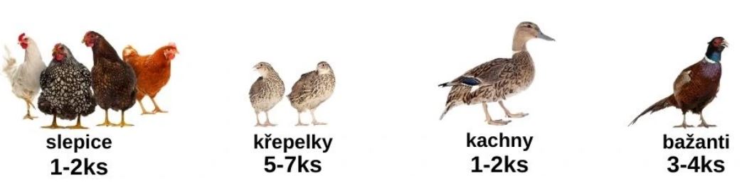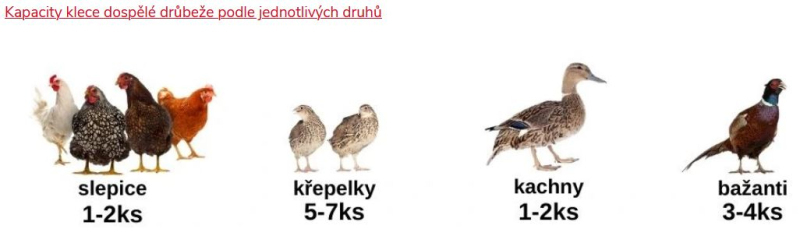 Kapacity klece dospělé drůbežepodle jednotlivých druhů