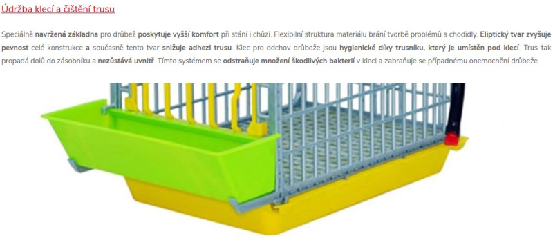 Speciálně navržená základna pro drůbež poskytuje vyšší komfort při stání i chůzi. Flexibilní struktura materiálu brání tvorbě problémů s chodidly. Eliptický tvar zvyšuje pevnost celé konstrukce a současně tento tvar snižuje adhezi trusu. Klec pro odchov drůbeže jsou hygienické díky trusníku, který je umístěn pod klecí. Trus tak propadá dolů do zásobníku a nezůstává uvnitř. Tímto systémem se odstraňuje množení škodlivých bakterií vkleci a zabraňuje se případnému onemocnění drůbeže.