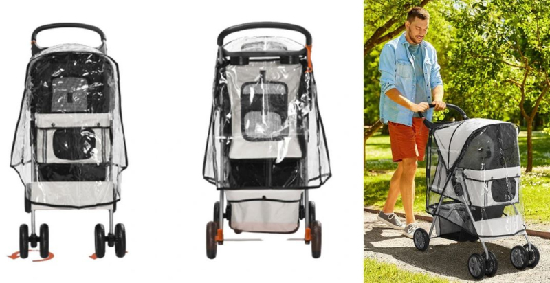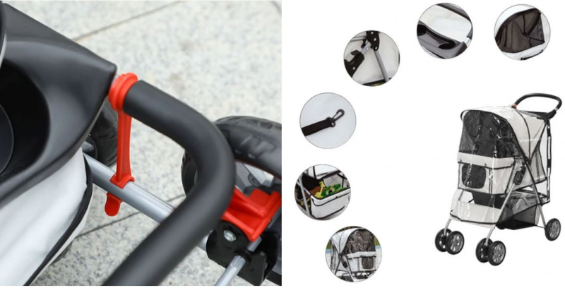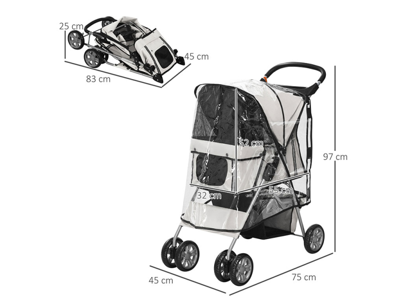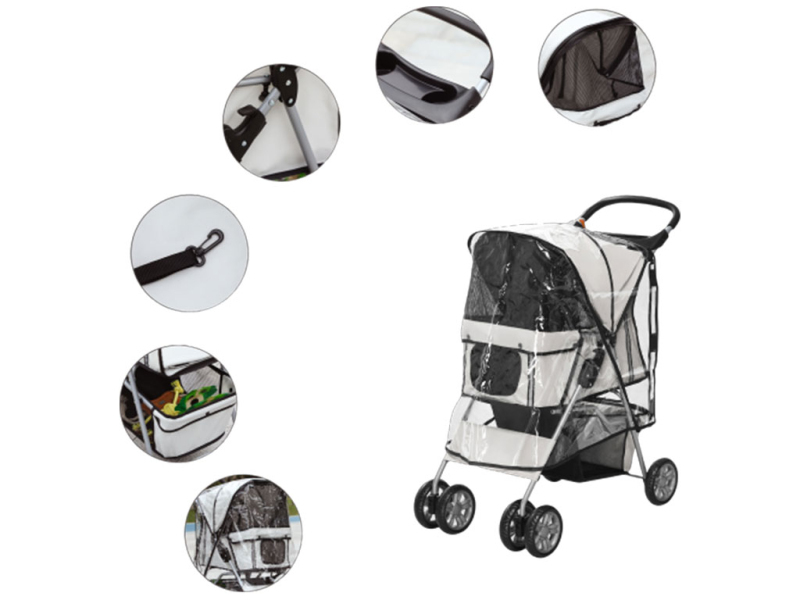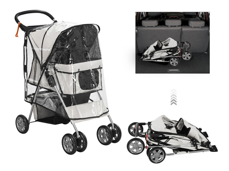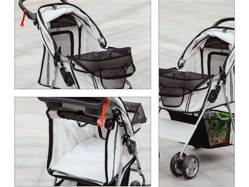 Se sklápěcí střechou proti sluncilze psa v kočárku snadno uzavřít a díky velkému síťovanému oknu v stříšce a síťovaným dvířkám má pes nejenom dobrý výhled, ale také přísun čerstvého vzduchu. Manipulace se psem bude přes přední a zadní rozepínací dvířka na zip snadná a psa následně můžete připnout na dvě bezpečnostní vodítka uvnitř kočárku. Kočárek má také dostatek úložného prostoru na výbavu pro psa. Spodní velká kapsa pod korbou kočárku slouží k uložení větších potřeb jako je láhev s vodou, vodítko, deka a další potřeby pro psy. Praktická kapsa na zip na zadních dvířkách je umístěná hned po ruce pro drobné potřeby jako jsou pamlsky, nebo doklady.