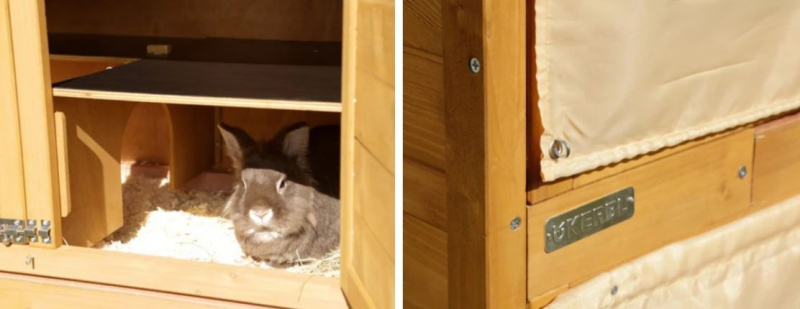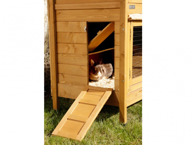 Mazlíčci budou mít v králíkárně dostatek prostoru a pohodlí. Králíci mohou odpočívat v menší části králíkárny, která jim nabídne příjemné soukromí a přítmí nebo ve větší prosvětlené části, která je vybavena pevnou mřížkou. Tato část s mřížkou je opatřena rolovací zástěnou pro ochranu před nepřízní počasí. Obě dvě patra králíkárny mohou být průchozí nebo je možné jednotlivá patra od sebe oddělit a uzavřít. Králíkárna má celkem čtyři samostatná přední dvířka, která jsou pro zvýšení bezpečnosti opatřeny druhým zámkem. Králíkárna je vybavena také bočními dvířky, kterými králíkovi můžete umožnit volný vstup do výběhu (výběh není součástí balení). Králíkárna je umístěna na čtyřech plastových nastavitelných nožkách.