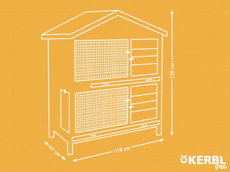 Vnější rozměry celé králíkárny jsou 118 x 61 x 130 cm, výška spodního patraje 50 cm, výška v horním patře je 59 cm. Dvoupatrová králíkárna poskytuje pohodlí pro dva králíky, zakrslé králíky, morčata nebo jiné malé hlodavce.
