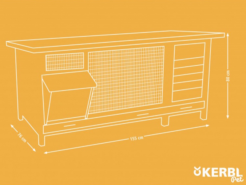 Dřevěná králíkárna pro chov králíků nebo jiných malých hlodavcůo rozměrech 155 x 76 x 80 cm. Jedná se o luxusní králíkárnu, která je vybavena vyjímatelným trusníkem pro snadné čistění, stojanem na seno a prostorem pro uschování krmení a doplňků. Bezproblémovýpřístup do králíkárny zajišťují dvoje přední a jedny boční dvířka a také výklopná střecha.