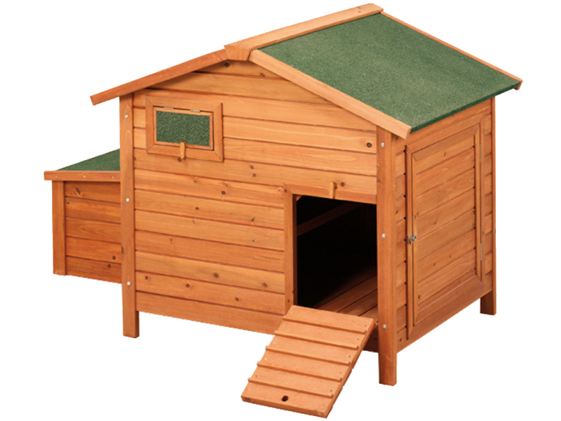 Dřevěný kurník pro 4-6 ks nosnic,z borovicového dřeva, vodotěsná střecha, boční prostorné dvířka, odnímatelné dno pro snadné čištění, 2 vodotěsná snášková hnízda, uzavíratelná vstupní rampa, větrací okno, bidýlka, rozměry 1115x900x900 mm.