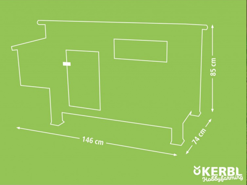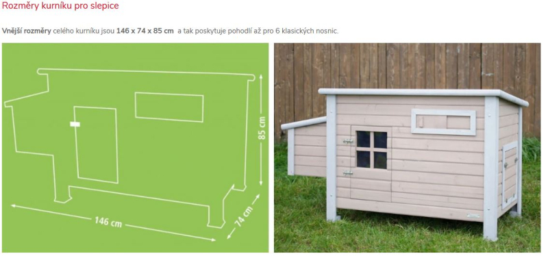 Vnější rozměry celého kurníku jsou 146 x74 x85 cm a tak poskytuje pohodlí až pro 6 klasických nosnic.