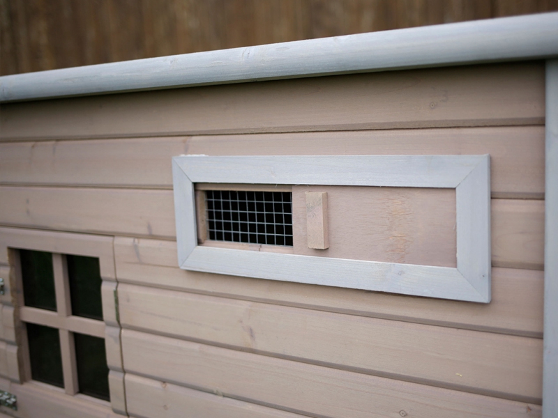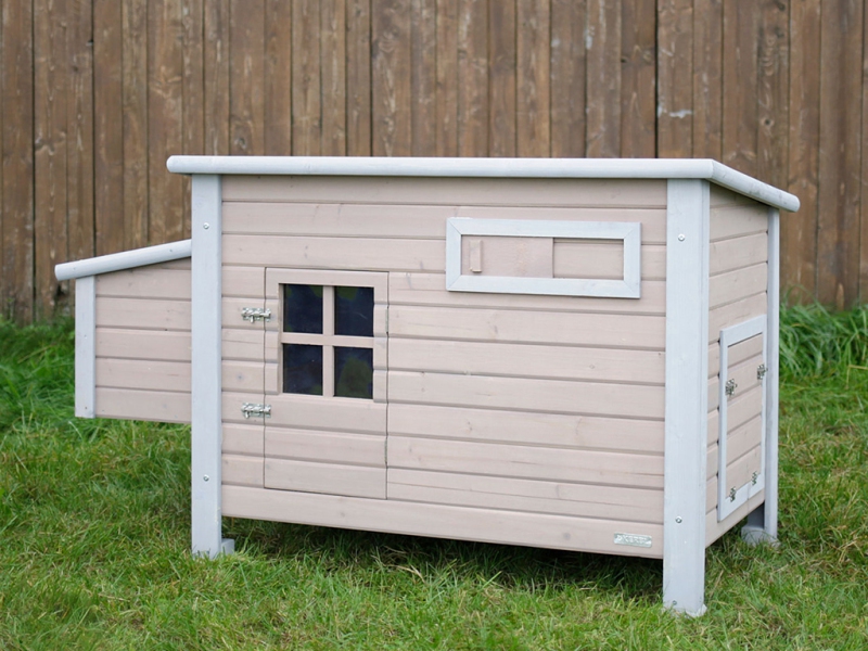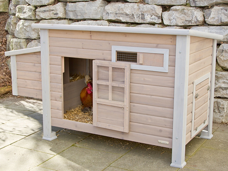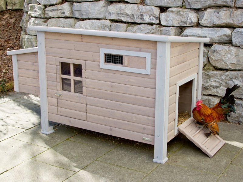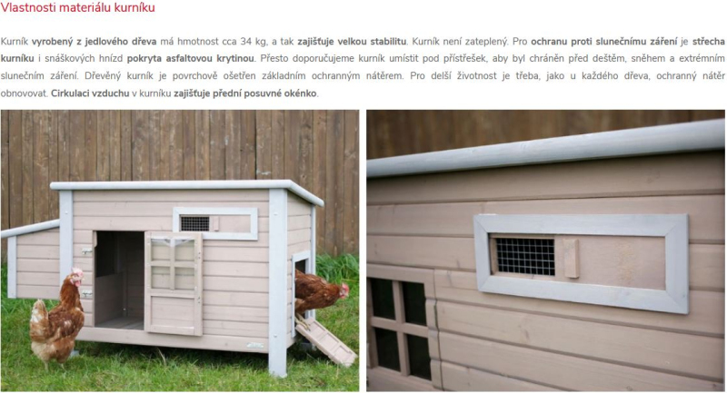 Kurník vyrobený z jedlového dřeva má hmotnost cca 34 kg, a tak zajišťuje velkou stabilitu. Kurník není zateplený. Pro ochranu proti slunečnímu záření je střecha kurníku i snáškových hnízd pokryta asfaltovou krytinou. Přesto doporučujeme kurník umístit pod přístřešek, aby byl chráněn před deštěm, sněhem a extrémním slunečním záření. Dřevěný kurník je povrchově ošetřen základním ochranným nátěrem. Pro delší životnost je třeba, jako u každého dřeva, ochranný nátěr obnovovat. Cirkulaci vzduchu v kurníku zajišťuje přední posuvné okénko.