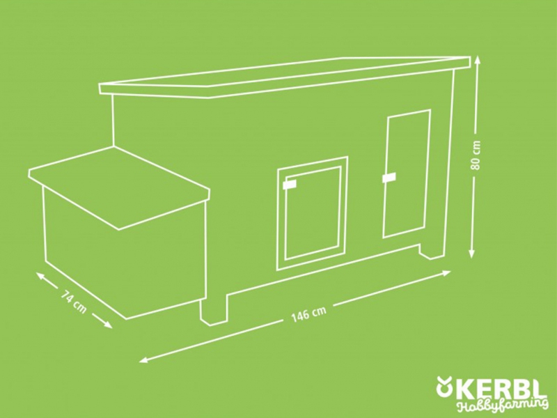 Vnější rozměry celého kurníku jsou 146 x74 x80 cm a tak poskytuje pohodlí až pro 5 klasických nosnic.