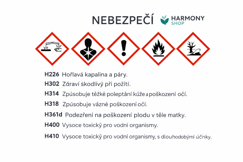 Nebezpečí:Toxický pro vodní organismy, s dlouhodobými účinky. Způsobuje těžké popálení kůže a poškození očí. Zabraňte uvolnění do životního prostředí. Uchovávejte mimo dosah dětí. Nevdechujte aerosoly. Hořlavá kapalina a páry. Odstraňte obsah/obal jako nebezpečný odpad.