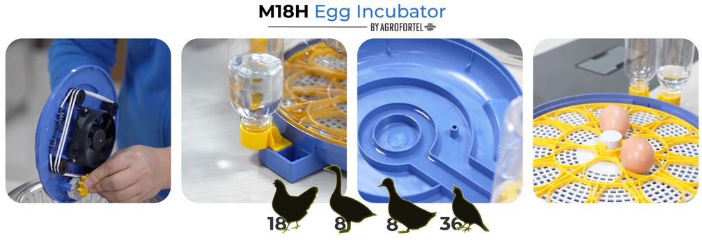 Líheň AGROFORTEL M18H je spolehlivým pomocníkem pro každého chovatele. Přístroj je vybaven automatickým otáčením vajec, přehledným displejem s ukazatelem teploty a vlhkosti a snadnou regulací vlhkosti pomocí vodních kanálků a ventilace.