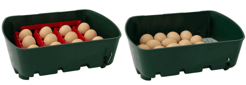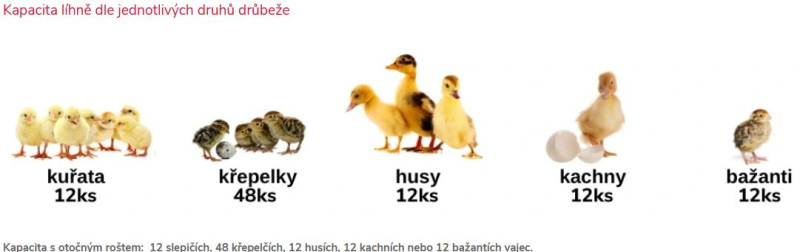 Kapacita s otočným roštem: 12 slepičích, 48 křepelčích, 12 husích, 12 kachních nebo 12 bažantích vajec.