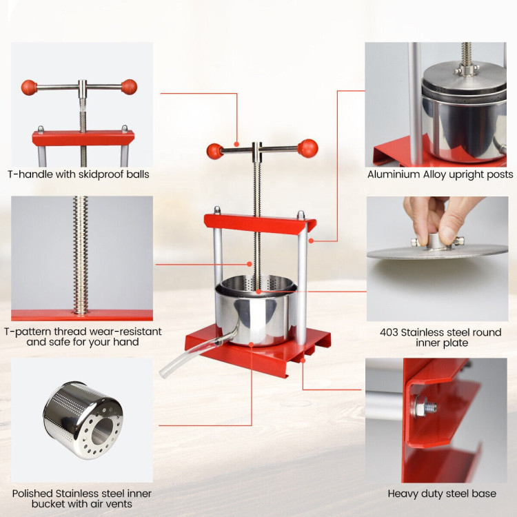 Představujeme Vám nerezový lis na ovoce (moštovač). Dřevěný materiál byl u tohoto modelu nahrazen ušlechtilou ocelí z důvodu delší životnosti a větší hygieničnosti. Lis na ovoce je ideální pro lisování ovoce s měkkou slupkou pro domácí víno a šťávy. Protože je tento moštovač ruční, lze ho použít téměř kdekoliv.