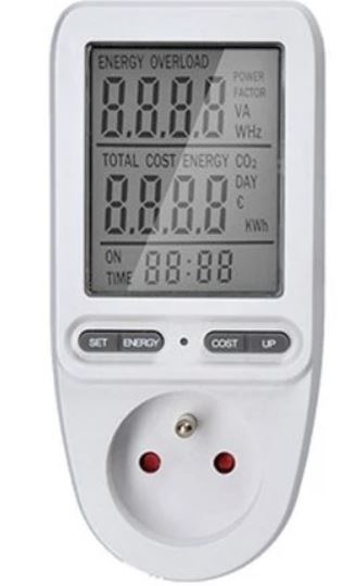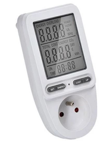 Digitální měřič spotřeby elektrické energie Solight DT27 s průběžnou zásuvkou a velkým LCD displejem. Měří přesně napětí, proud, frekvenci a okamžitý odebíraný výkon. Velikou výhodou je možnost nastavení ceny za energii, čímž dosáhnete přesného výpočtu celkové ceny za odebranou energii připojeného spotřebiče.