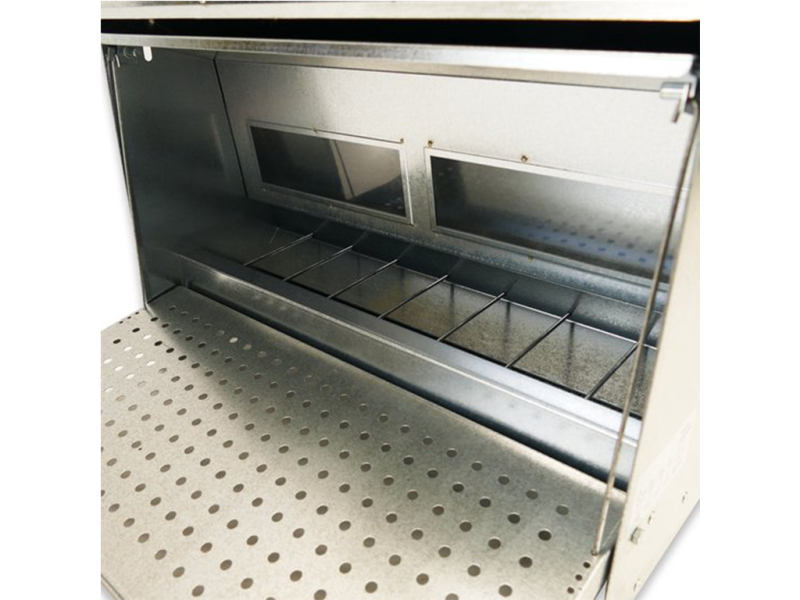 Nášlapné krmítko pro slepice, drůbež, 40 kg krmiva, do 100 slepic, automatické, odolné, snadno omyvatelný pozinkovaný povrch. Pokud hledáte kvalitní automatické jednostranné nášlapné krmítko, pak nemůžete vybrat lépe. Drůbež bude mít po celý den dostatečný přístup k čistému a čerstvému krmivu a Vaším úkolem přitom bude pouze nasypání krmiva do zásobníku. Víko zásobníku má madlo pro snadnější otevření tohoto samokrmítka. Když si slepice stoupne na nášlapnou plošinu, mechanismus otevře víko a zpřístupní jí krmení. Po seskočení z plošiny se krmítko opět uzavře. Nášlapné krmítko pro slepice je vyrobeno ze silného pozinkovaného plechu, a proto bude jeho čištění a údržba opravdu snadná. Rozměry: 450 x 470 x 635 mm.