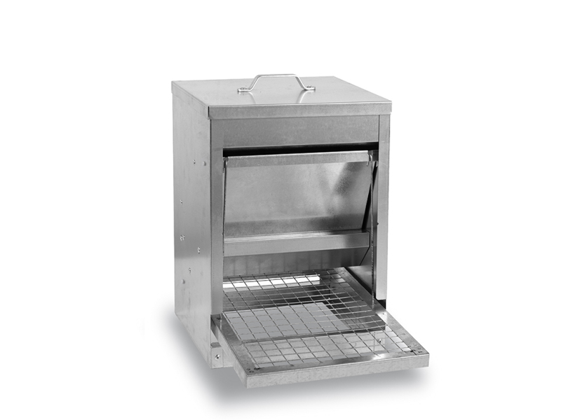 Pokud hledáte kvalitní automatické jednostranné nášlapné krmítko, pak nemůžete vybrat lépe. Drůbež bude mít po celý den dostatečný přístup k čistému a čerstvému krmivu a Vaším úkolem přitom bude pouze nasypání krmiva do zásobníku. Víko zásobníku má madlo pro snadnější otevření tohoto samokrmítka. Když si slepice stoupne na nášlapnou plošinu, mechanismus otevře víko a zpřístupní jí krmení. Po seskočení z plošiny se krmítko opět uzavře. Nášlapné krmítko pro slepice je vyrobeno ze silného pozinkovaného plechu, a proto bude jeho čištění a údržba opravdu snadná.