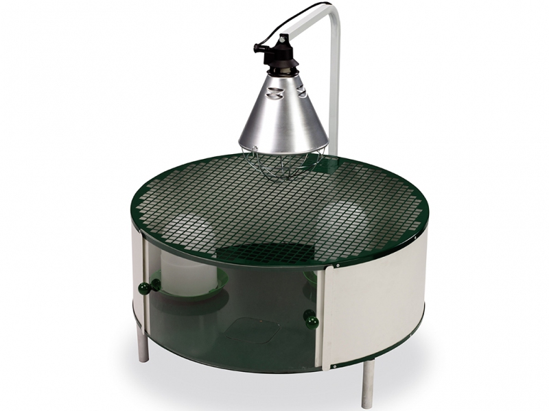 Odchovna drůbeže, až 30 kuřat, kruhová, hliníková lampa s infračervenou žárovkou, 2 l napáječka, 2 kg krmítko, rozměry Ø71 x 79 cm.