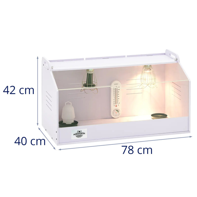Kompletní sada příslušenství: V balení najdete misku na krmení a napáječku, topnou lampu se stmíváčem, vnitřní osvětlení a teploměr s vlhkoměrem.