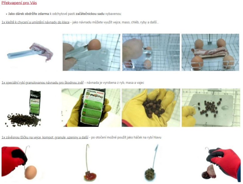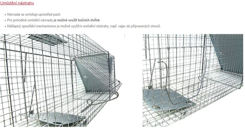 - Návnada se umísťuje na druhém konci pasti od vstupu do odchytové klece.