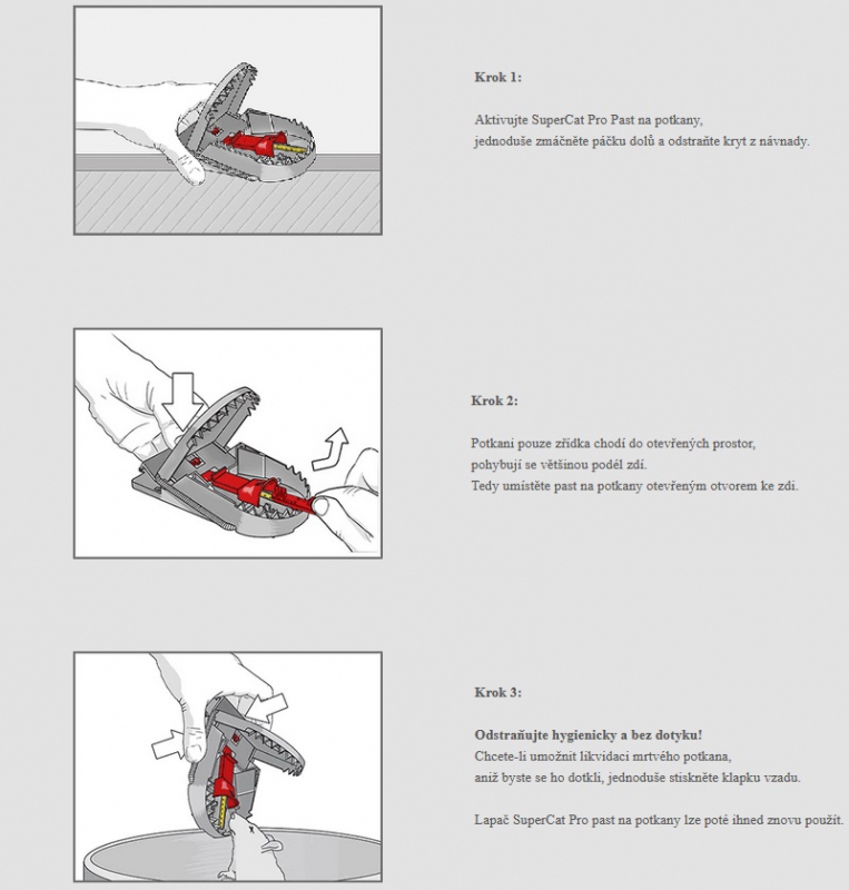 Odstraňujte hygienicky a bez dotyku! Chcete-li umožnit likvidaci mrtvého potkana, aniž byste se ho dotkli, jednoduše stiskněte klapku vzadu. Lapač SuperCat Pro past na potkany lze poté ihned znovu použít.