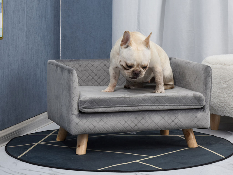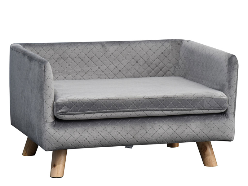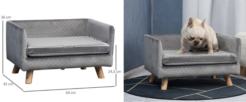 Pohovka pro psa do 8 kg, měkký sametový potah, pevné a protiskluzové nohy, odnímatelná podložka, rozměry 64x45x36 cm.