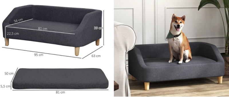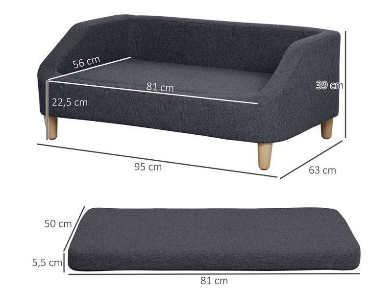 Pohovka pro psa do 25 kg, měkký polštář, pevné protiskluzové nohy, odnímatelná pěnová podložka, celkové rozměry 95x63x39 cm.