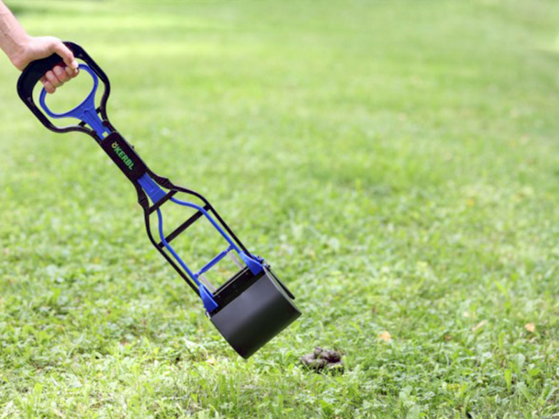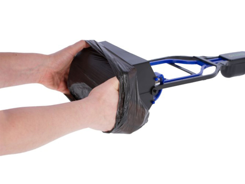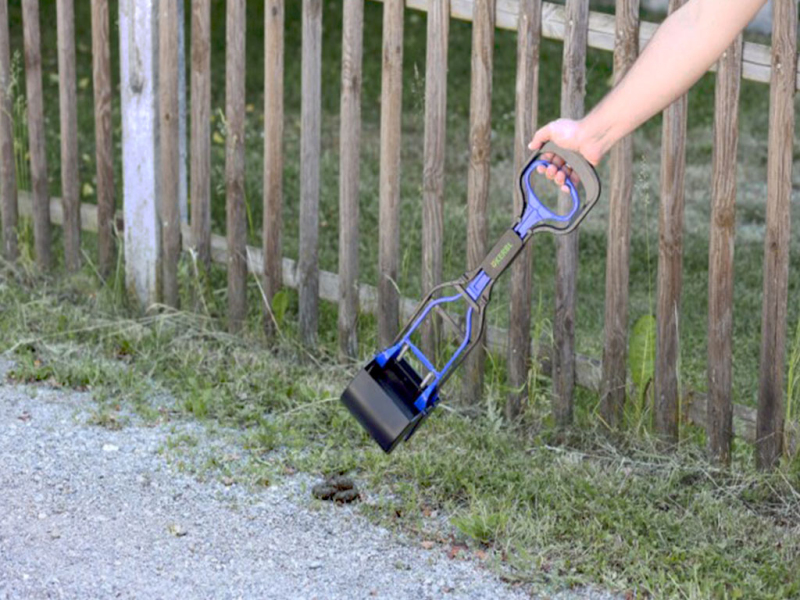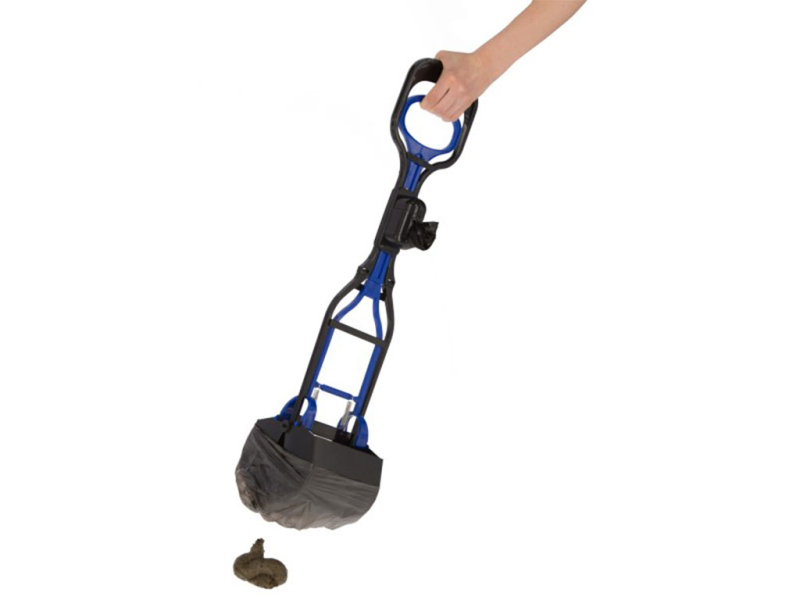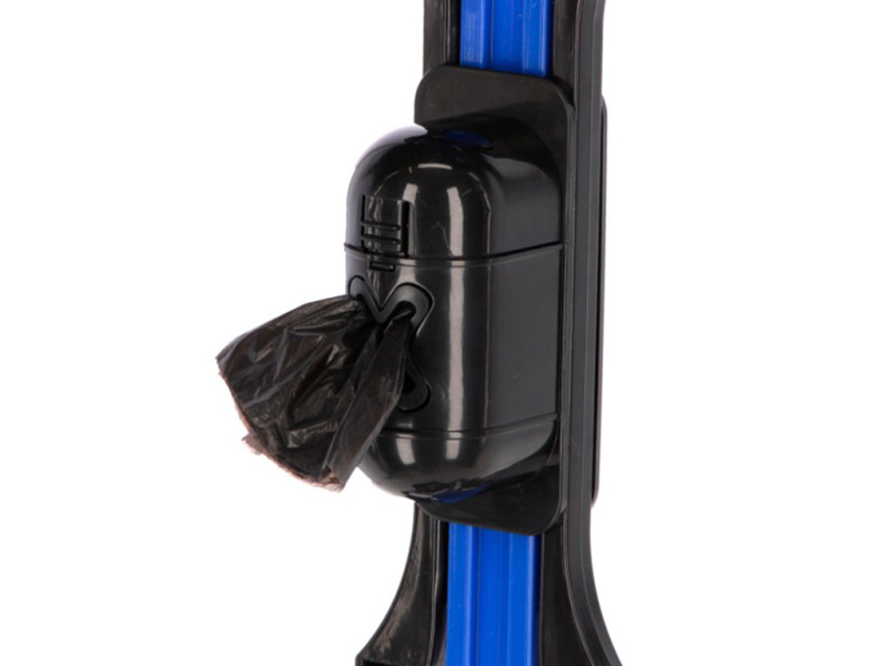 Plastový sběrač na psí exkrementy, pružinový mechanismus s dávkovačem sáčků, na všechny typy povrchů, s rozměry 71 x 13 x 14 cm.