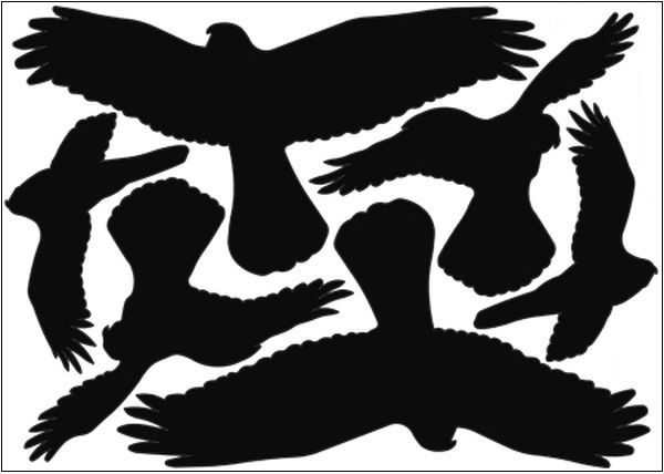 Realistické samolepky našich dravců - použití jako samolepka okna (obě strany černé) a jiné hladké povrchy k plašení a ochraně ptáků.
