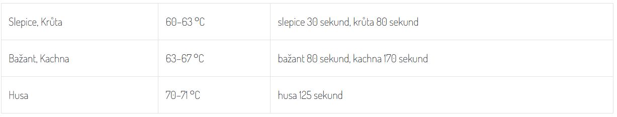 Před škubáním je nutné drůbež vždy správně spařit. Nikdy nepařte drůbež delší dobu než v tabulce - delší čas ponoření poté znamená že se Vám může trhat kůže. Uvedené časy jsou VŽDY orientační a doručuje se průběžně manuálně zkoušet snadnost škubání.